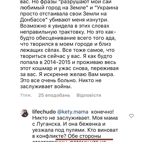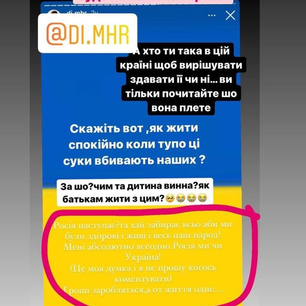 Проводила гів з російськими блогерами в перший тиждень війни. На час повномасштабної війни втекла з чоловіком росіянином закордон, тримає нейтралітет, не називає напряму росію агресором